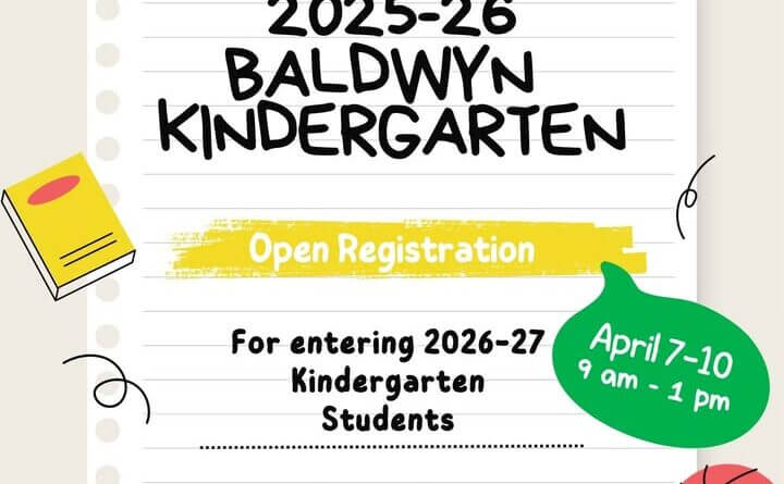 Baldwyn Elementary will host pre-registration for the 2026-27 kindergarten class from April 7 to 10. The event is for children who will turn 5 years old on or before Sept. 1, 2026.