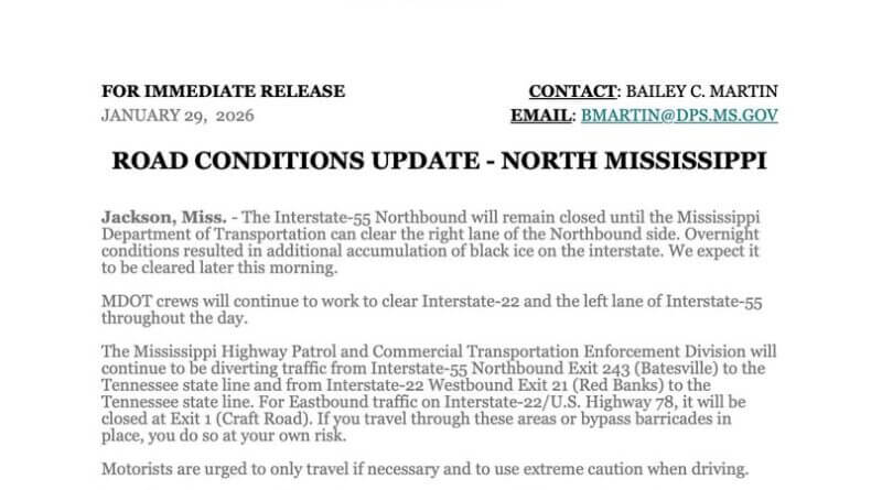 The northbound lanes of Interstate 55 will remain closed until the Mississippi Department of Transportation can clear the right lane, officials said.
