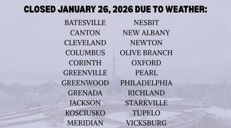 Mississippi’s Northern and Central Driver Service Stations will be closed Thursday as winter weather impacts the state, according to the Mississippi Department of Public Safety.