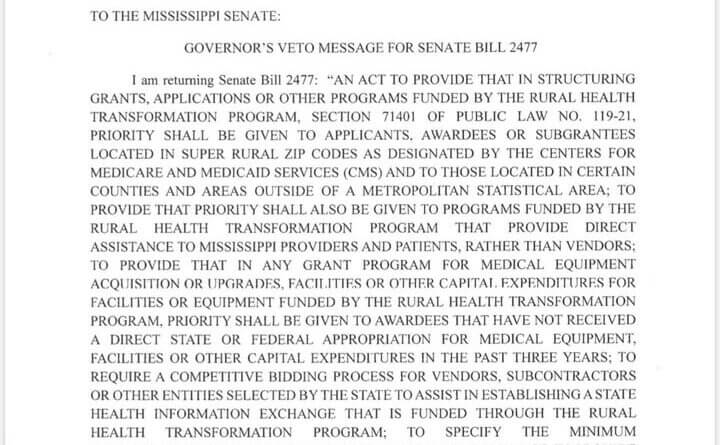 Mississippi governor vetoes bill threatening rural health funding