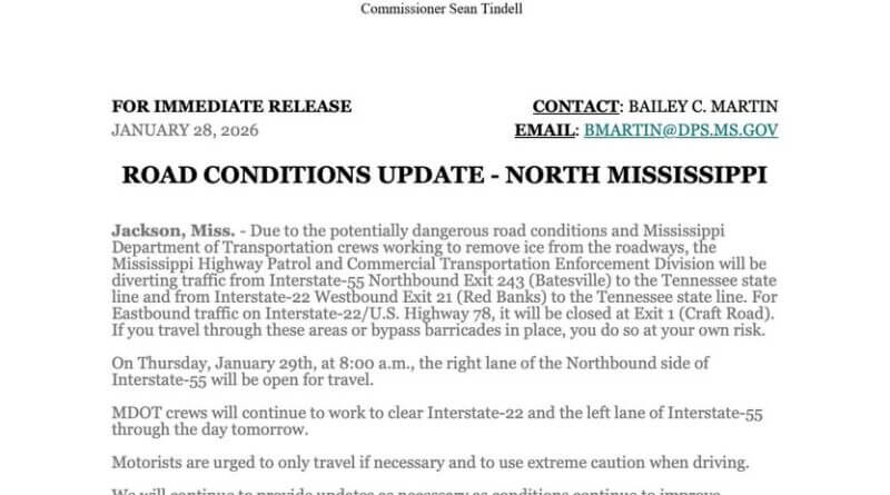 Mississippi Department of Transportation crews are working to remove ice from roadways, prompting traffic diversions on several highways, according to the Mississippi Highway Patrol and Commercial Transportation Enforcement Division.