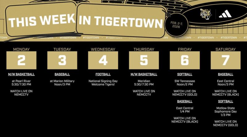 For a detailed schedule, visit bit.ly/NECompSchedule. The college’s sports teams are part of Tiger Town, the school’s athletic nickname and branding.